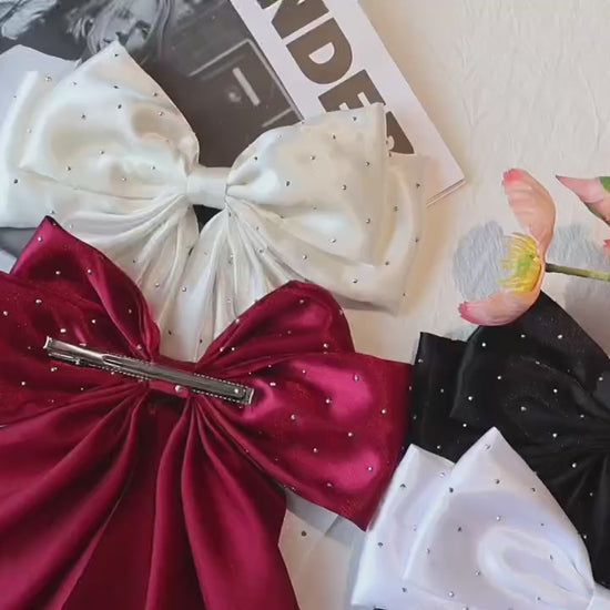 # Big Satin Rhinestone Bowknot Hair Clip for Womens Elevate your hair styling with this statement-making bowknot clip, crafted from luxurious satin and adorned with sparkling rhinestones. The generous size ensures a secure hold while delivering an instantly polished look, whether you're styling an updo or adding dimension to loose waves. Perfect for both everyday elegance and special occasions, this piece combines refined craftsmanship with versatile styling potential.